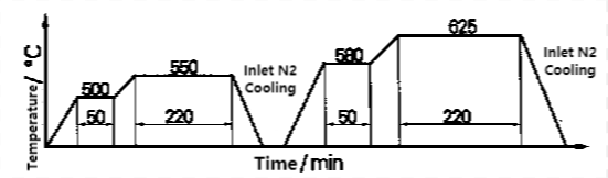 We use two tempering, the tempering process is 550℃×220min+625℃×220min, the pressure used for tempering is 0.045MPa, and the tempering process curve is shown in the figure. After quenching and tempering, the quenching hardness of EPN is 54-55.5HRC, and the tempering hardness is 42-43.4HRC.