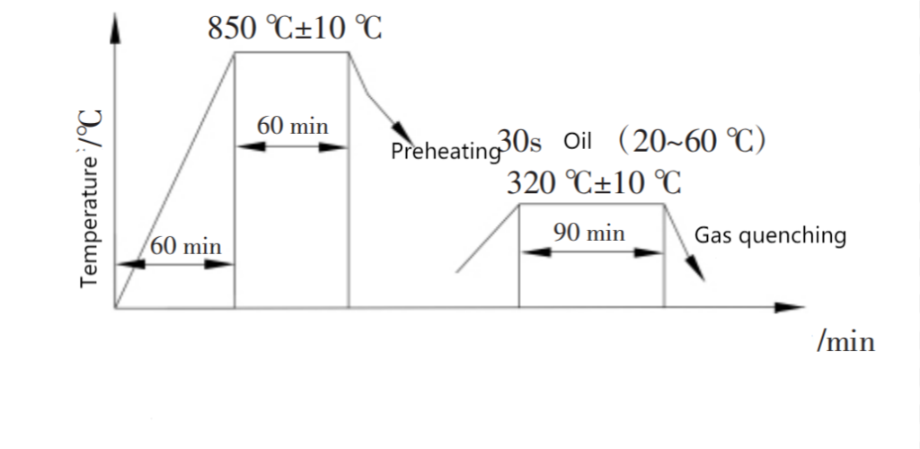 The schematic diagram of heat treatment of riser casing is shown in the figure. In order to solve the oxidation deformation of the riser casing, vacuum heat treatment is adopted. In the double-chamber vacuum quenching furnace, non-oxidative heating and quenching is carried out to provide a guarantee for the bright quenching of the casing and ensure that the surface of the casing is free from oxidation. The double-chamber vacuum quenching furnace requires a vacuum heating chamber and a vacuum quenching chamber, and the vacuum degree should reach below 10Pa. The temperature control ensures that the workpiece is heated at high temperature and the quenching process is continuously carried out under a fully enclosed high vacuum, so as to ensure the heat treatment quality of the casing.